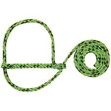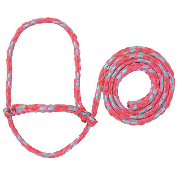 This fully-adjustable 3/8" poly rope sheep halter is made from traditional "parachute" rope, the same rope traditionally used to construct equine rope halters. This style adjusts easily on the animal and features a snap with a shorter lead that allows you to quickly secure your animal in a pen or wash rack. A great value, this halter comes in a cool selection of color combinations. Measures 52" long with the headpiece condensed.