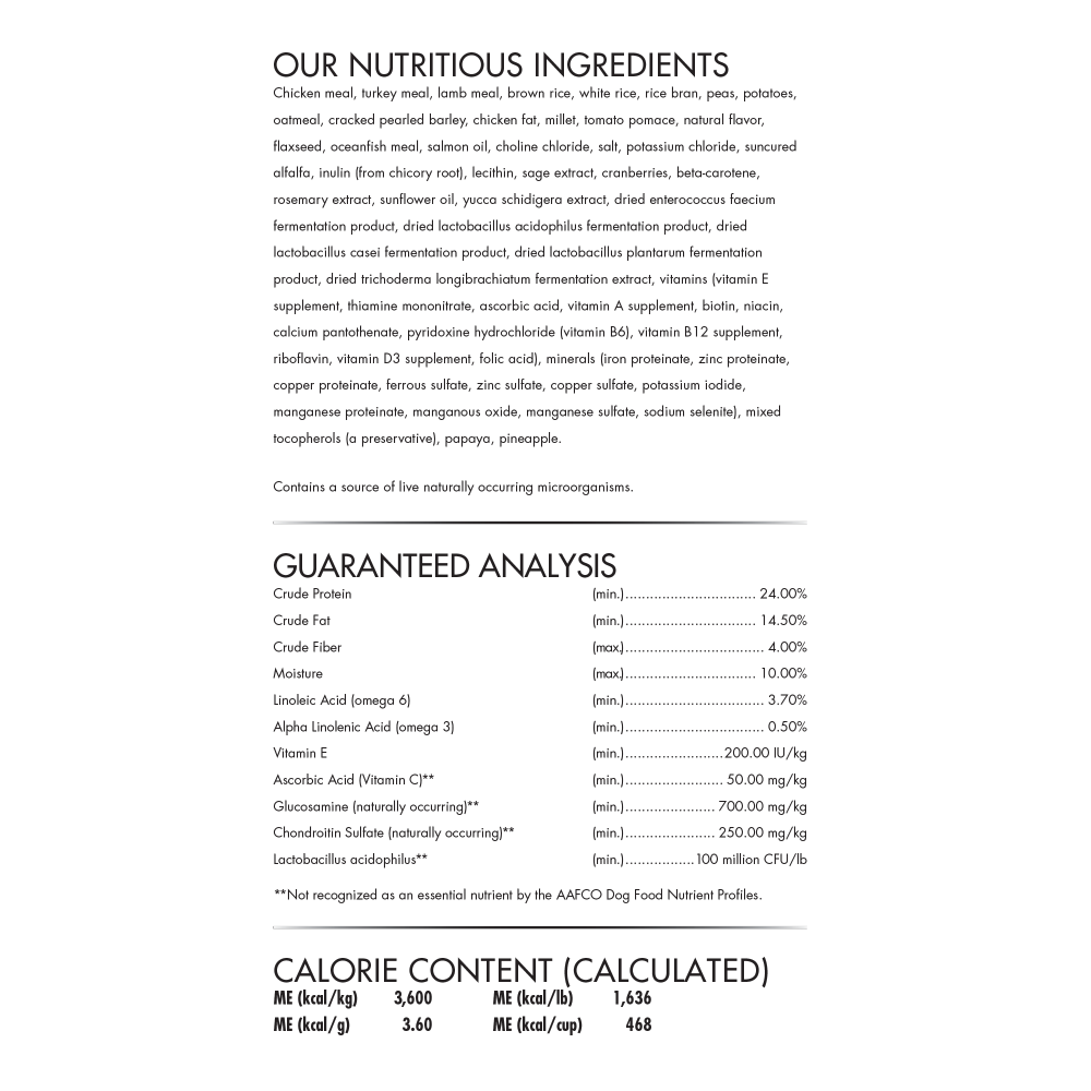 Chicken meal, turkey meal, lamb meal, brown rice, white rice, rice bran, peas, potatoes, oatmeal, cracked pearled barley, chicken fat, millet, tomato pomace, natural flavor, flaxseed, oceanfish meal, salmon oil, choline chloride, salt, potassium chloride, suncured alfalfa, inulin (from chicory root), lecithin, sage extract, cranberries, beta-carotene, rosemary extract, sunflower oil, yucca schidigera extract, dried enterococcus faecium fermentation product, dried lactobacillus acidophilus fermentation product, dried lactobacillus casei fermentation product, dried lactobacillus plantarum fermentation product, dried trichoderma longibrachiatum fermentation extract, vitamins (vitamin E supplement, thiamine mononitrate, ascorbic acid, vitamin A supplement, biotin, niacin, calcium pantothenate, pyridoxine hydrochloride (vitamin B6), vitamin B12 supplement, riboflavin, vitamin D3 supplement, folic acid), minerals (iron proteinate, zinc proteinate, copper proteinate, ferrous sulfate, zinc sulfate, copper sulfate, potassium iodide, manganese proteinate, manganous oxide, manganese sulfate, sodium selenite), mixed tocopherols (a preservative), papaya, pineapple.Contains a source of live naturally occurring microorganisms.