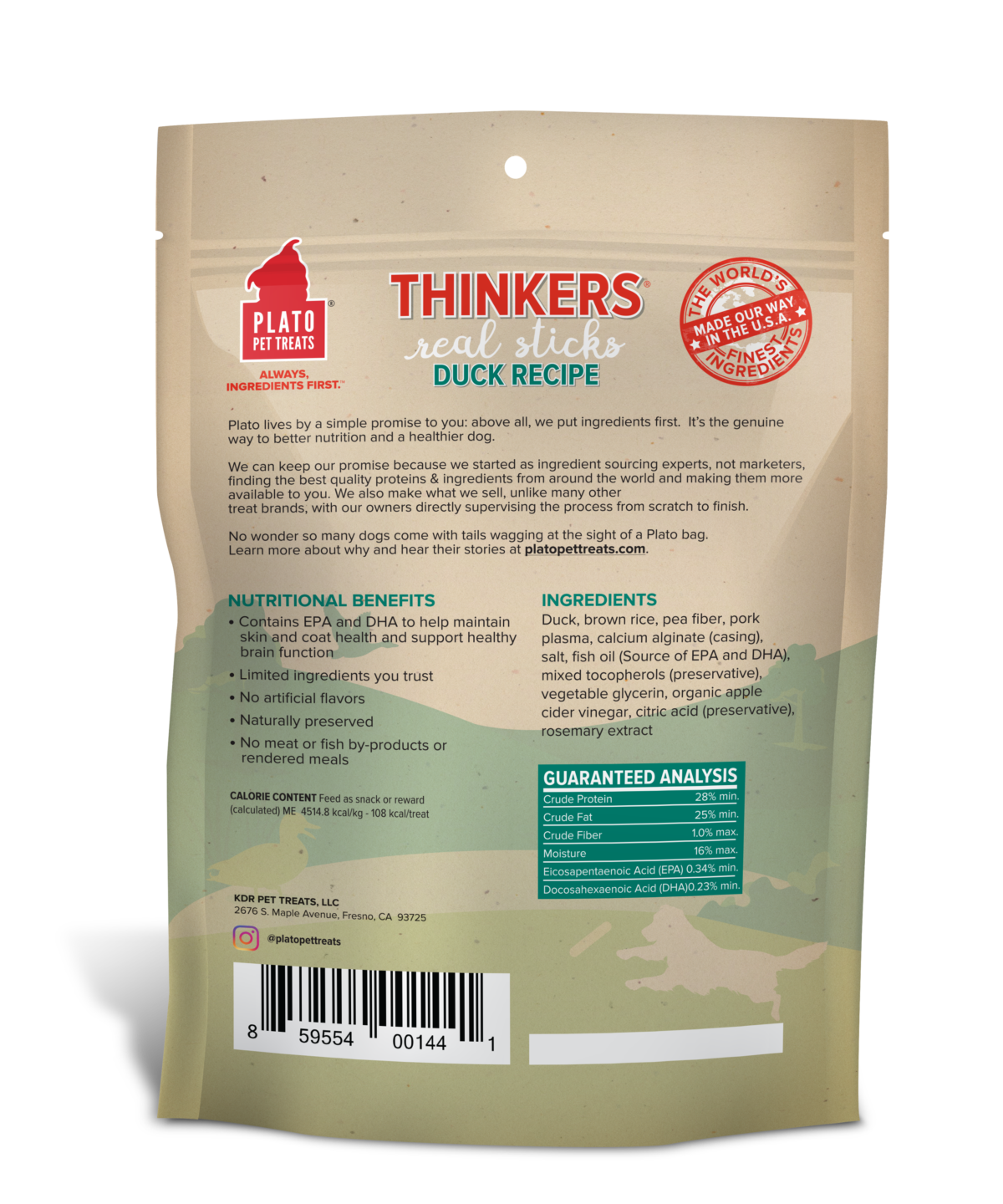 Thinkers Duck are hearty, meat-packed sticks with added EPA and DHA to support healthy brain function.  Made with real duck as the 1st ingredient, these treats are made with limited ingredients, are naturally preserved, and contain no artificial flavors, corn, wheat, or soy.  Because of their large size, Thinkers offer substantial chewing satisfaction or can be broken into smaller pieces to create multiple treats.  And we take the extra time to air-dry them in batches in our USA facility instead of baking them in order to retain more of the ingredients’ inherent nutrients  (but your dog will just think that they smell and taste amazing). It takes longer, but we think its worth it. Thinkers also come in Chicken and Salmon.