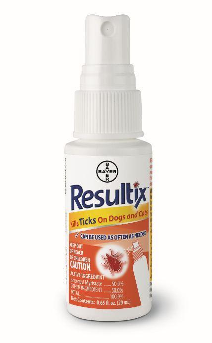 Bayer Resultix Tick Spray is a convenient, easy-to-use topical spray that helps remove and kill attached and crawling ticks on your dog or cat. Once Resultix is sprayed directly on the tick, it works quickly in dissolving the tick's outer shell, and killing the tick. Resultix is a tick solution free of conventional pesticides and can be used as often as needed.