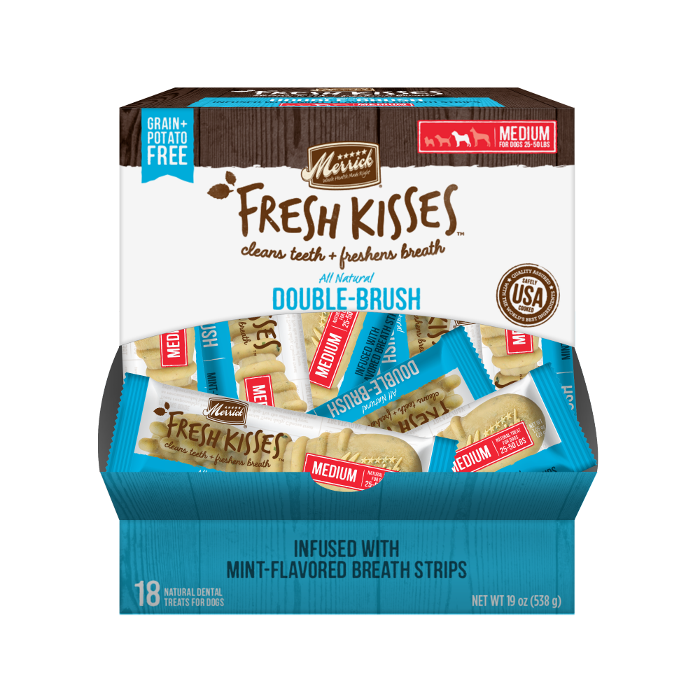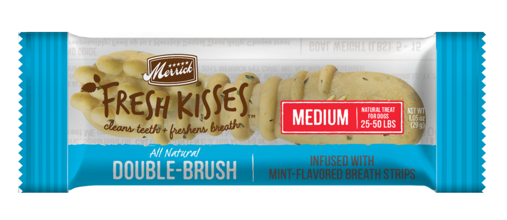 Close cuddles and sweet smooches with your fur buddy just got better with new Merrick Fresh Kisses, an innovative natural dental treat designed not only to clean dog’s teeth but to freshen breath at the same time. While many dental treats effectively reduce plaque and tartar, until now limited options have been available to also freshen breath. Merrick Fresh Kisses do both. The dental treats feature a double-brush design to clean teeth by removing plaque and tartar during the chewing action of the treat. These dental treats are made with natural ingredients specially formulated to freshen breath. Merrick Fresh Kisses are the only dental treat to be both grain-free and potato-free. Made with all-natural ingredients for a healthy dog.