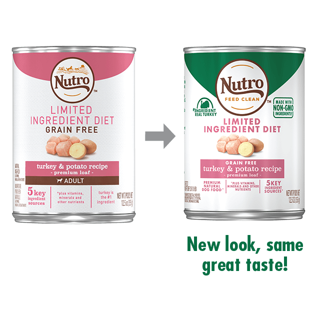 Your dog won’t be able to resist getting their paws on a can of NUTRO™ Limited Ingredient Diet Turkey & Potato Recipe Adult Dog Food. Farm-raised turkey is the first ingredient in this wet food designed for dogs with food sensitivities. This grain-free canned wet dog food is made with natural ingredients plus vitamins, minerals, and other nutrients, and is full of flavor that adult dogs big and small go crazy for. This NUTRO recipe is made with non-GMO ingredients†, NO corn, wheat, or soy, NO chicken by-product meal, and NO artificial preservatives, flavors, or colors. Plus, it’s made at facilities committed to zero waste to landfill. Give your dog NUTRO Limited Ingredient Diet recipes with the NUTRO FEED CLEAN logo every day for ultimate tail wags.