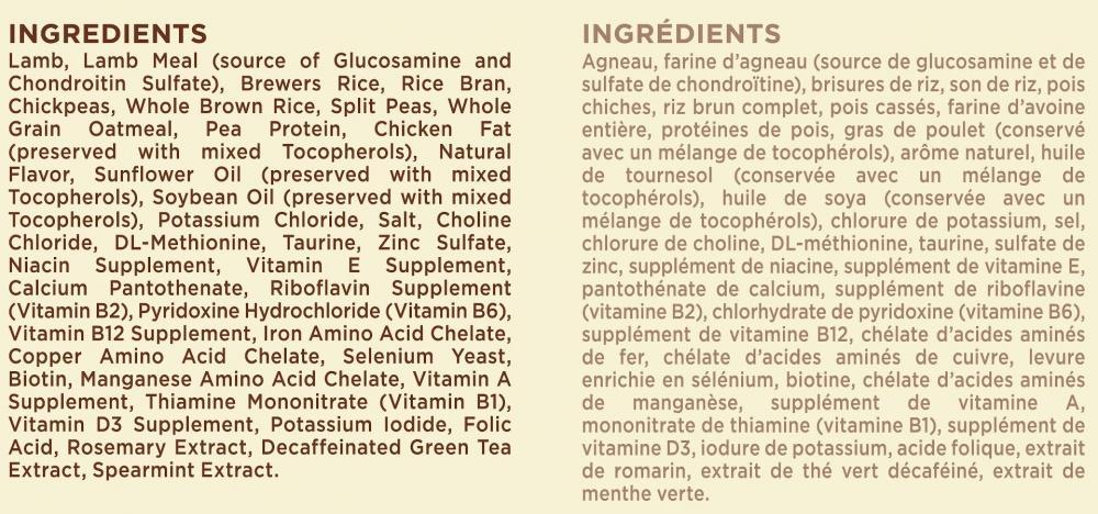 Lamb, Lamb Meal (source of Glucosamine and Chondroitin Sulfate), Brewers Rice, Rice Bran, Chickpeas, Whole Brown Rice, Split Peas, Whole Grain Oatmeal, Pea Protein, Chicken Fat (preserved with mixed Tocopherols), Natural Flavor, Sunflower Oil (preserved with mixed Tocopherols), Soybean Oil (preserved with mixed Tocopherols), Potassium Chloride, Salt, Choline Chloride, DL-Methionine, Taurine, Zinc Sulfate, Niacin Supplement, Vitamin E Supplement, Calcium Pantothenate, Riboflavin Supplement (Vitamin B2), Pyridoxine Hydrochloride (Vitamin B6), Vitamin B12 Supplement, Iron Amino Acid Chelate, Copper Amino Acid Chelate, Selenium Yeast, Biotin, Manganese Amino Acid Chelate, Vitamin A Supplement, Thiamine Mononitrate (Vitamin B1), Vitamin D3 Supplement, Potassium Iodide, Folic Acid, Rosemary Extract, Decaffeinated Green Tea Extract, Spearmint Extract.