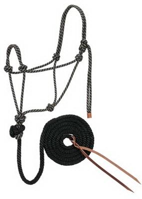 A great halter at a great price! This halter is made from a continuous piece of 3/8" poly rope with a hand-knotted construction and a double noseband and crown strap. The hollow braid spun poly lead measures 1/2" x 10'.